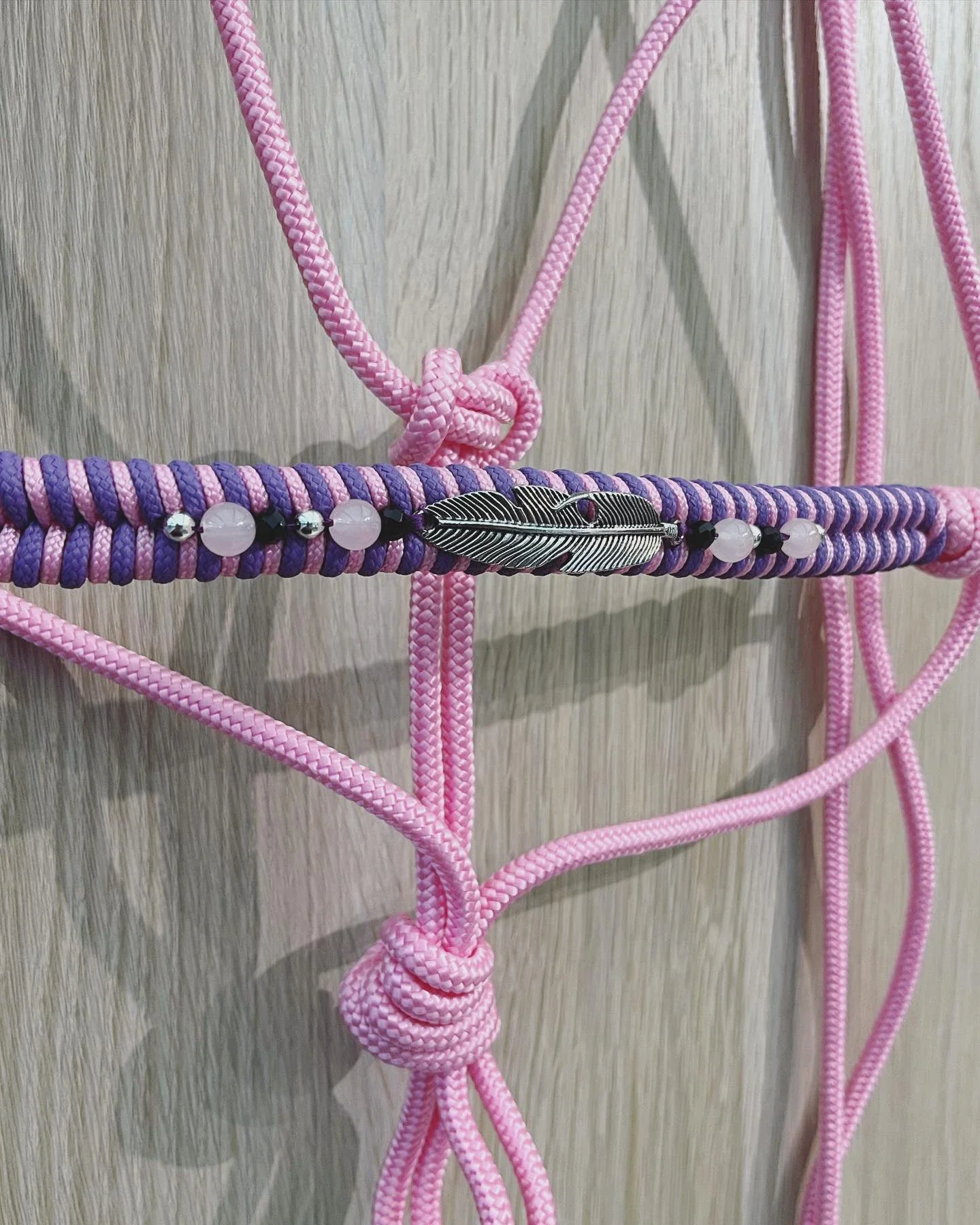 Licol éthologique réalisé à la main à partir d’une corde de 6 mm, avec tressage épis décoratif et perles pour une finition esthétique et personnalisée.
